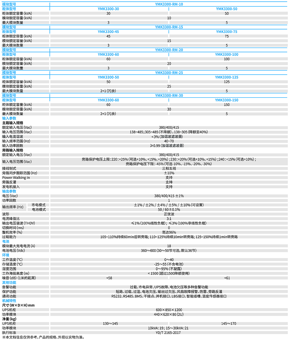 所有單元均采用模塊化設計,包含功率模塊、旁路模塊、監控模塊、配電模塊(限單柜),功率模塊為3U,旁路模塊為3U,監控模塊1U,配電模塊11U,適配19英寸標準機柜