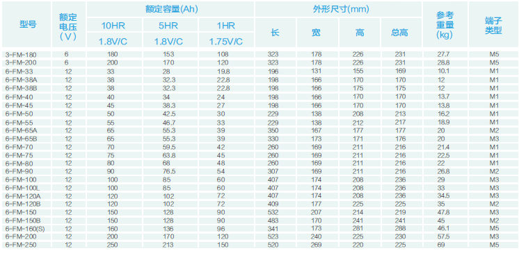 在20℃環(huán)境下,F(xiàn)M系列小型密封電池浮充壽命可達(dá)3~5年,F(xiàn)M固定型密封電池浮充壽命可達(dá)8~10年,F(xiàn)ML系列電池浮充壽命可達(dá)10年,F(xiàn)MH系列電池浮充壽命可達(dá)10年,GFM系列、太陽能深循環(huán)系列電池浮充壽命可達(dá)15年,GFMJ系列電池浮充壽命可達(dá)18年。